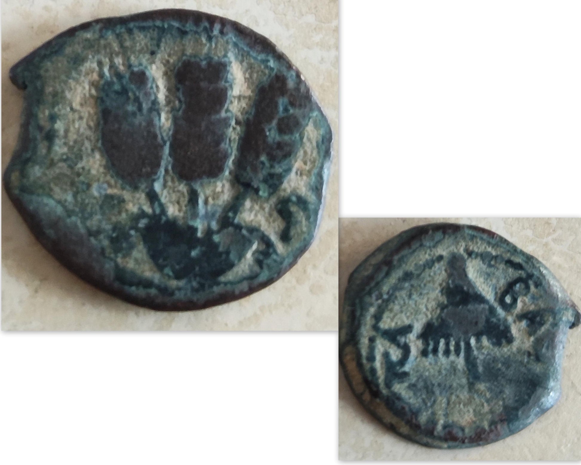 This bronze coin was minted in the sixth year of Herod Agrippa's reign (41\42 AD).