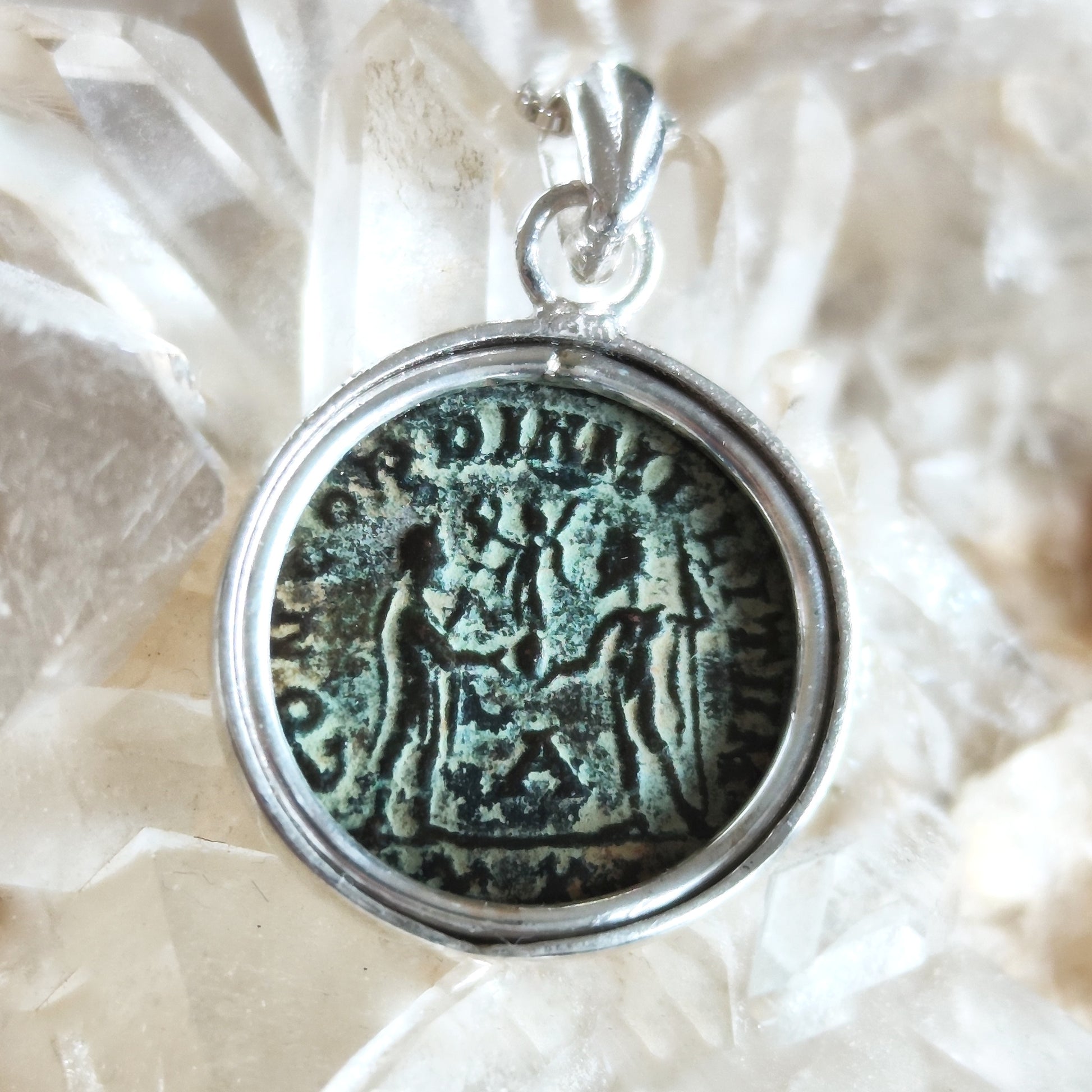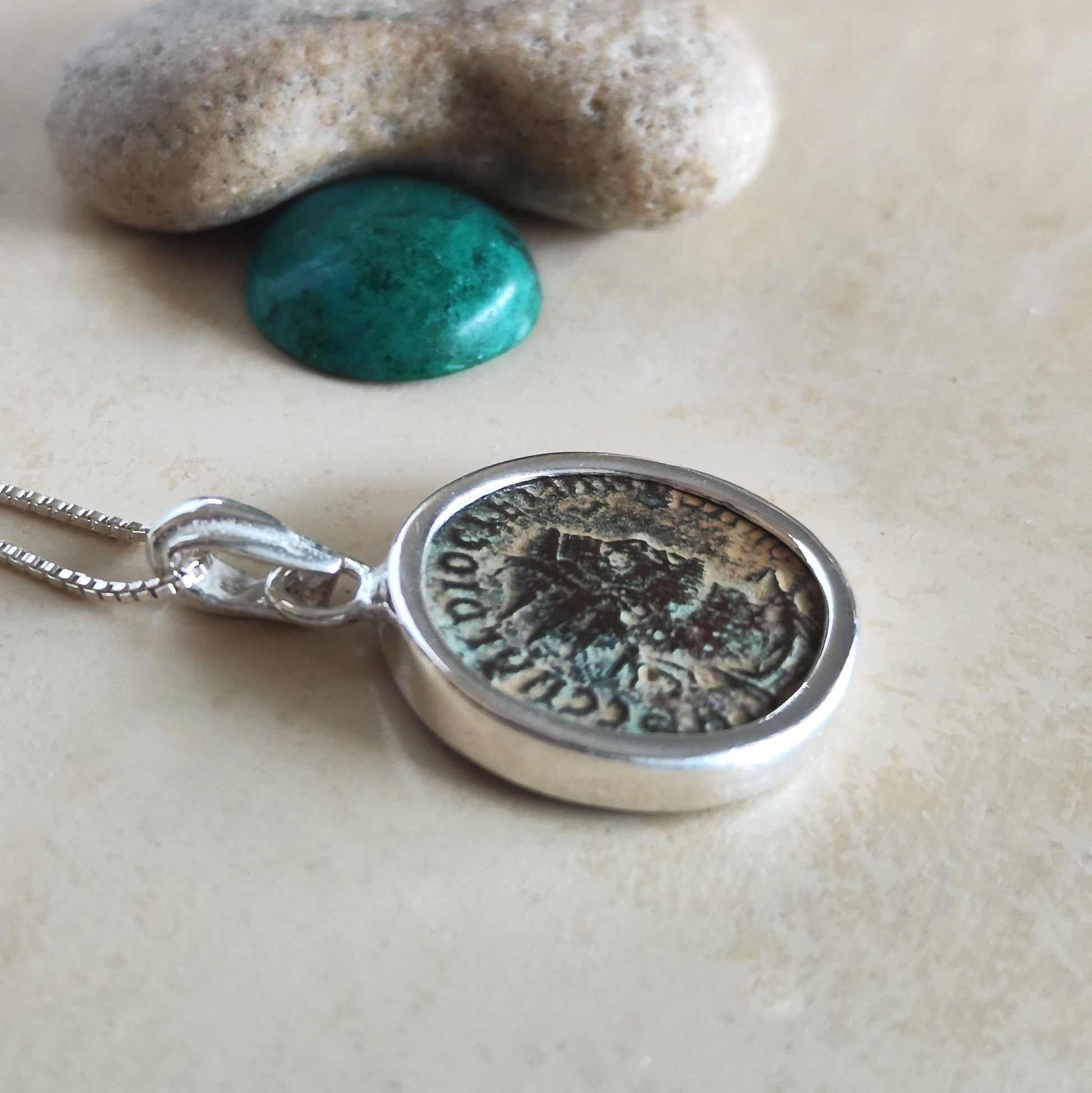 This Ancient Roman Coin Pendant features a Genuine antique coin of Emperor Diocletian, set in a minimalist Silver Reversible medallion. The coin is approximately 1700 years old! β¦ Very good quality coin, with many clear visible coin details and a lovely light brown-greenish patina. π Please note that photos are taken under bright light, so the coin looks slightly lighter than in regular daylight. This Roman Coin pendant includes an Authenticity certificate from an authorized antiquities dealer. β¦ The front side of coin depicts the profile of Diocletian, who was a Roman emperor from 284 to 305. Born to a family of low status in Dalmatia, Diocletian rose through the ranks of the military to become a cavalry commander of the Emperor Carus's army. After the deaths of Carus and his son Numerian on campaign in Persia, Diocletian was proclaimed emperor. Reverse side shows emperor standing right holding sceptre and receiving Victory on globe from Jupiter standing left π DETAILS β¦ The coin is set in a simple minimalist bezel made of 925 Sterling silver ,with an elegant bale. β¦ Pendant Diameter- about 0.8" (20mm). The pendant is slightly oval/ irregular to fit the shape of the coin.