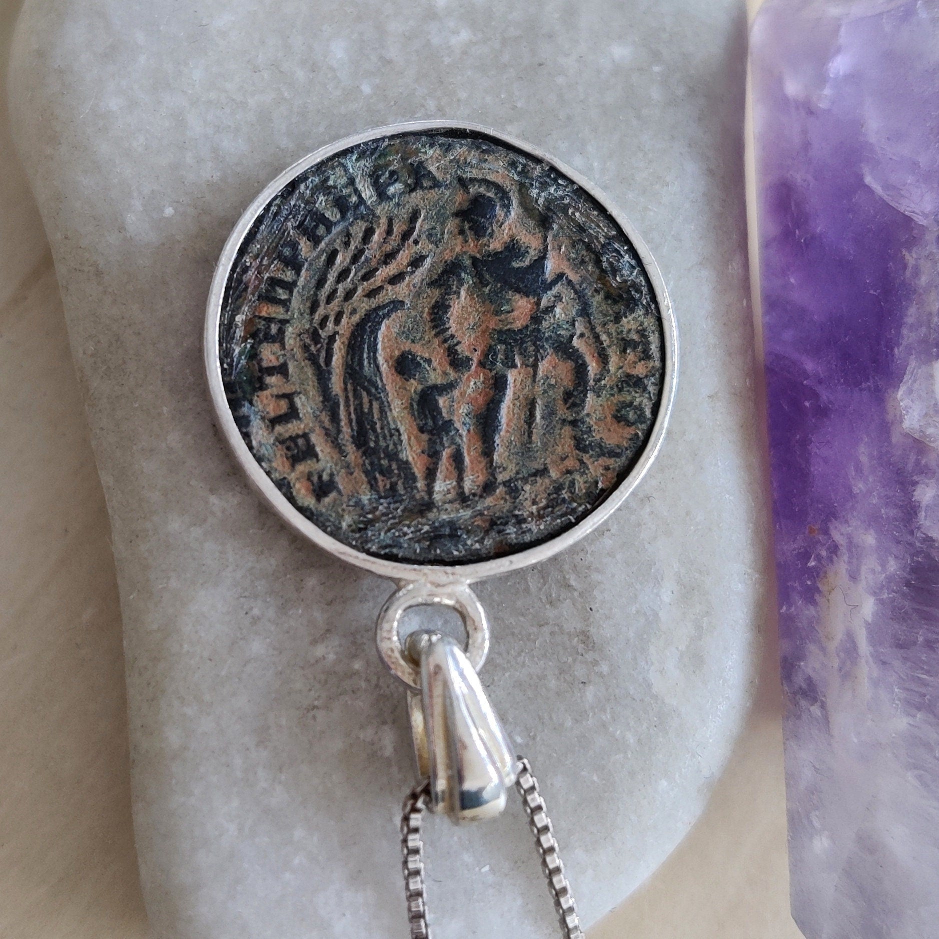 A one of a kind reversible medallion featuring a real antique Roman bronze coin - It is approximately 1700 years old!