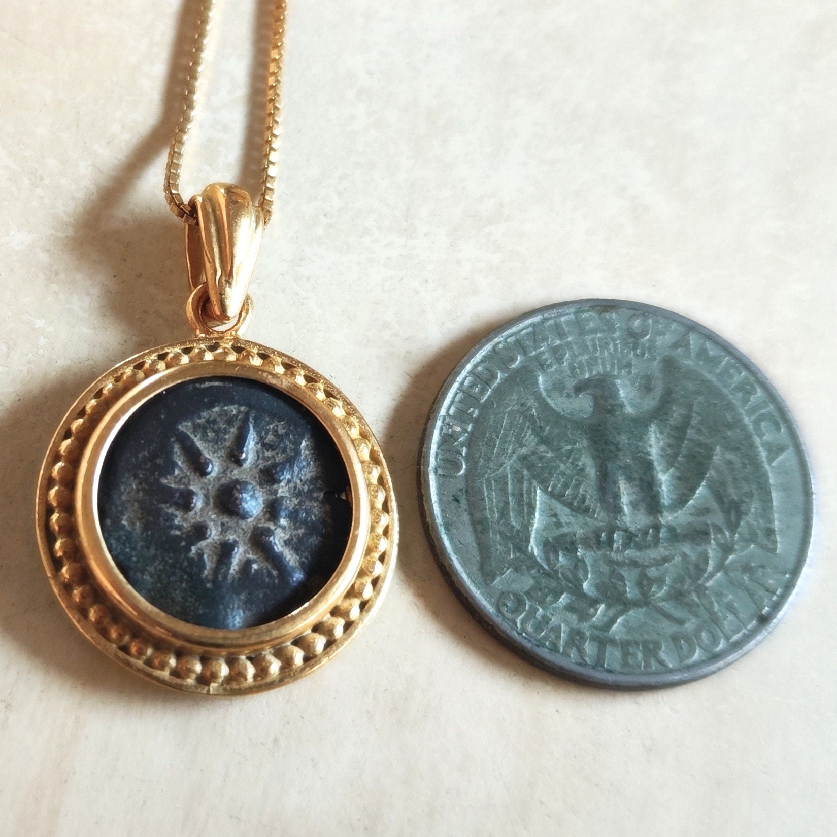 ♦ The coin is set in a thick 18K gold plating over 925 Sterling silver bezel with an elegant bale. The gold plating color is vibrant yellow.