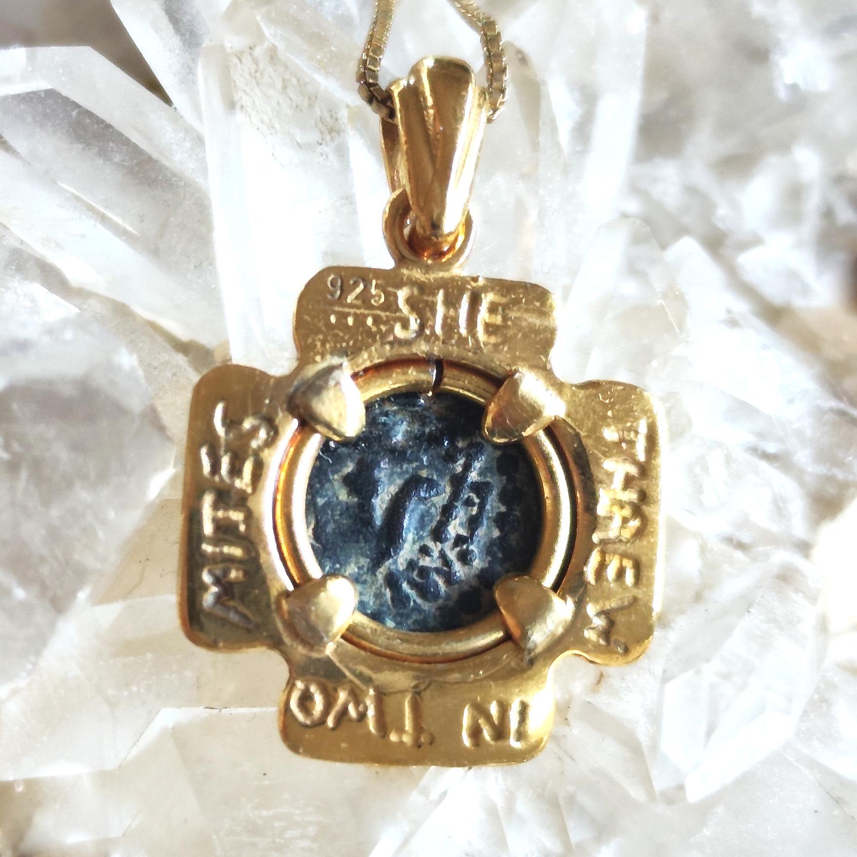 This genuine widow’s mite pendant holds a real antique coin that is around 2000 years old, set in a thick 18K Gold plated 925 Sterling Silver Jerusalem Cross style pendant.