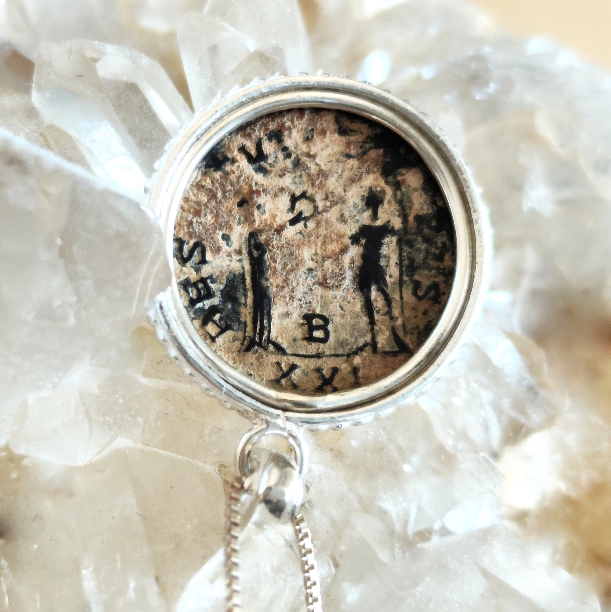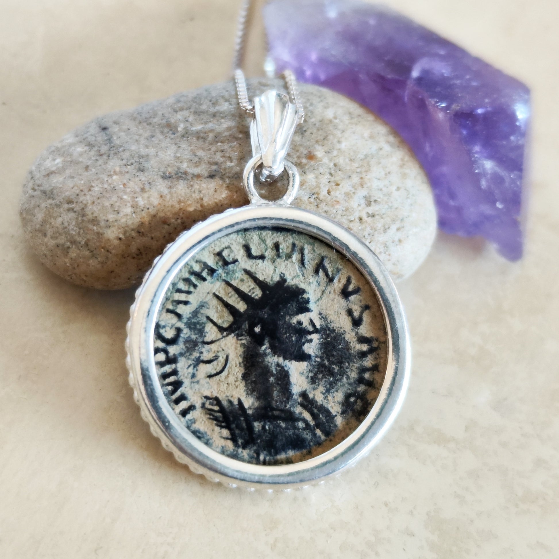 Genuine Certified Ancient Roman Bronze Coin Pendant featuring Emperor Aurelian. This Silver medallion holds a REAL ANTIQUE Roman Antonianus coin - It is approximately 1700 years old! ♦ Very good quality coin, with many visible details on both sides. The coin has a beautiful light desert brown patina. 👉 Please note that these photos were taken under bright light so the coin looks lighter than in regular daylight. ♦Including a certificate of Authenticity!♦ ♦ The front side depicts the profile of Emperor Aurelian, who was Roman emperor from 270 to 275. Aurelian was one of the most important Roman emperors, best known for his military campaigns that restored the unity of the Roman Empire. Reverse shows a female figure presenting wreath to Aurelian on right holding spear.📌 DETAILS ♦ The coin is set in a newly designed elegant bezel, decorated around in antique style dotted pattern, made of 925 Sterling silver. ♦ Pendant Diameter- about 0.9" (22 mm). ♦ You can purchase this pendant with or without a chain. We offer a 16", 18" ,20", 22" silver box chain ♥ To shop Barr Designs on Etsy -> BarrDesigns.etsy.com ♥ Find us on Instagram -> instagram.com/BarrDesigns UPS/FedEx Express shipping from Israel, 3-5 business days delivery at a special price of 25$ (usually $45). Available upon checkout.