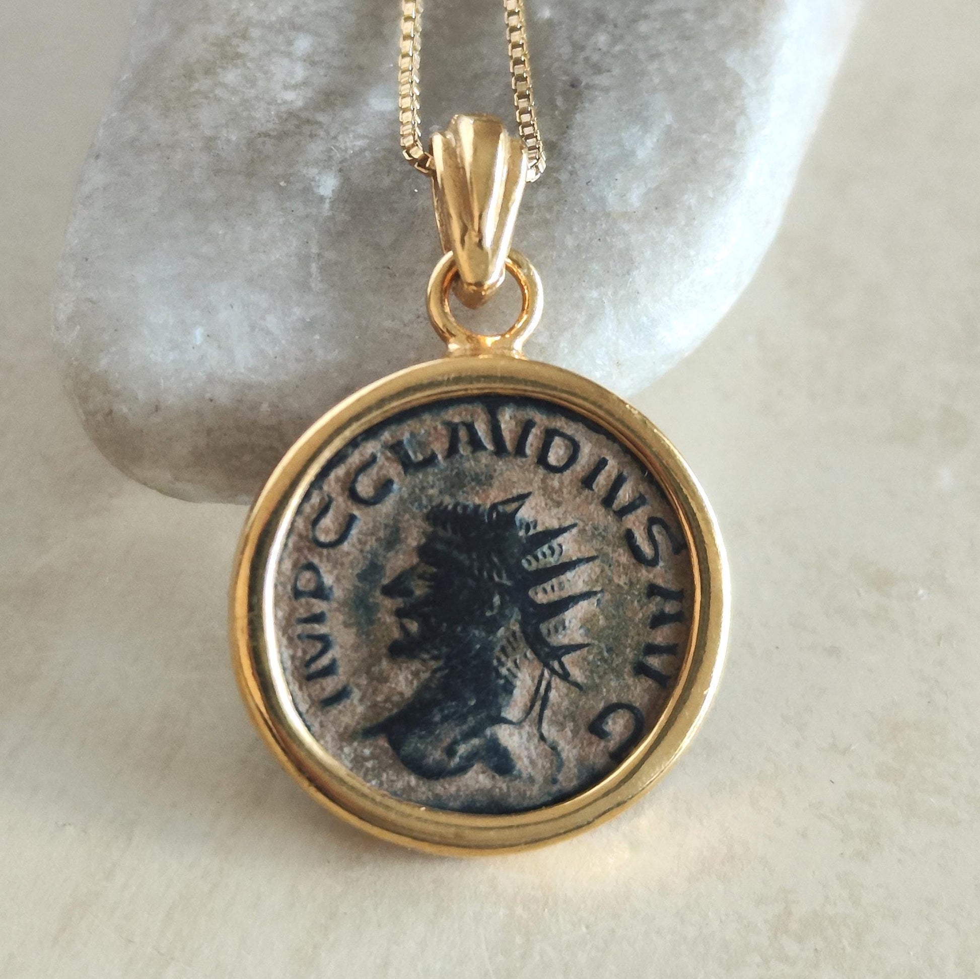 This Ancient Roman Coin Pendant features a Genuine antique coin of Roman Emperor Claudius II, set in a Gold Plated medallion. The coin is approximately 1700 years old!