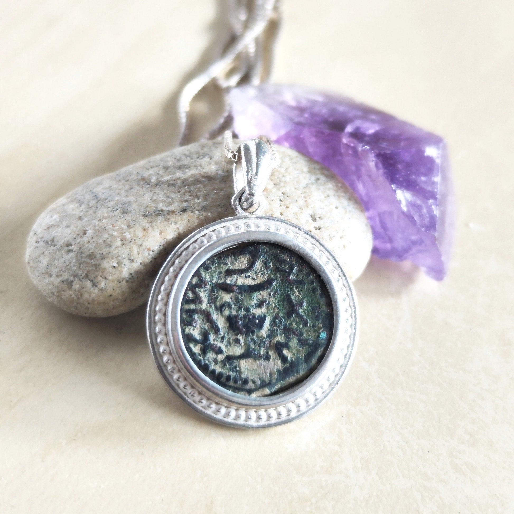 First Jewish war bronze Prutah necklace, Ancient Masada Revolt Coin Silver pendant, Jerusalem second temple coin, roman amphora medallion