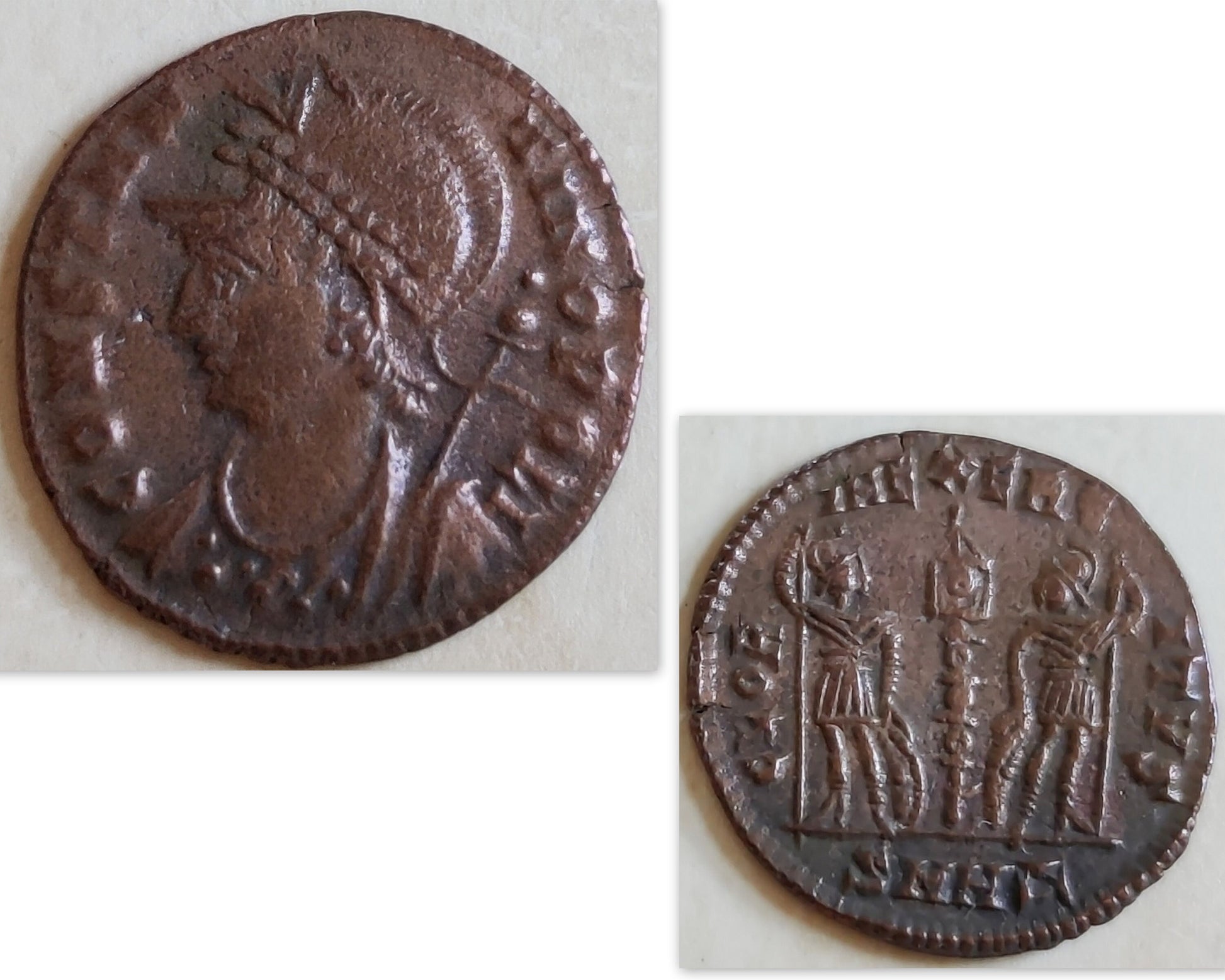 ♦ Front depicts the profile of Emperor Flavius Julius Constantius, known as Constantius II, son of Constantine the Great, who was Roman emperor from 337 to 361. His reign saw constant warfare on the borders against the Sasanian Empire and Germanic peoples, while internally the Roman Empire went through repeated civil wars, court intrigues and usurpations